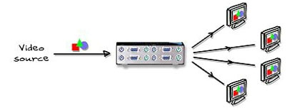 - En ensam videosignal kan visas på fyra skärmar samtidigt.