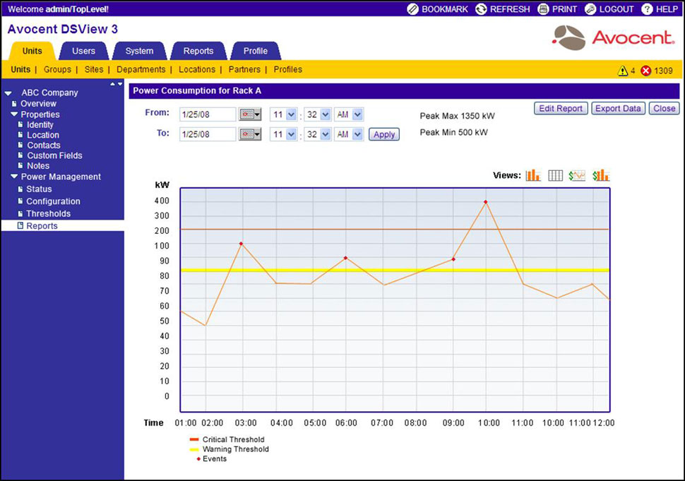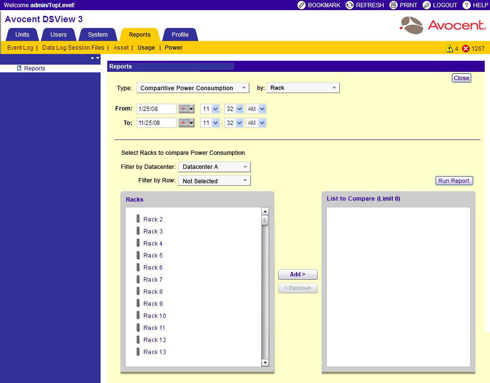 DSView 3 Power Manager samlar in information från Cyclades PM-enheter och andra enheter som stöds för att ta fram historiska grafer och rapporter. IT-administratörer och chefer kan analysera total kostnad och kapacitet över enskilda PDU: s, rack, rader av rack eller hela data centers.