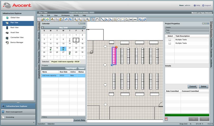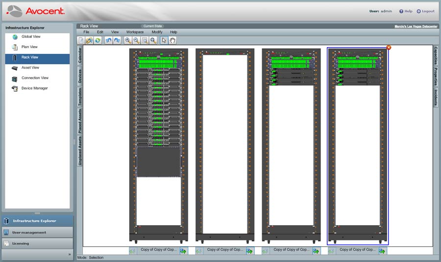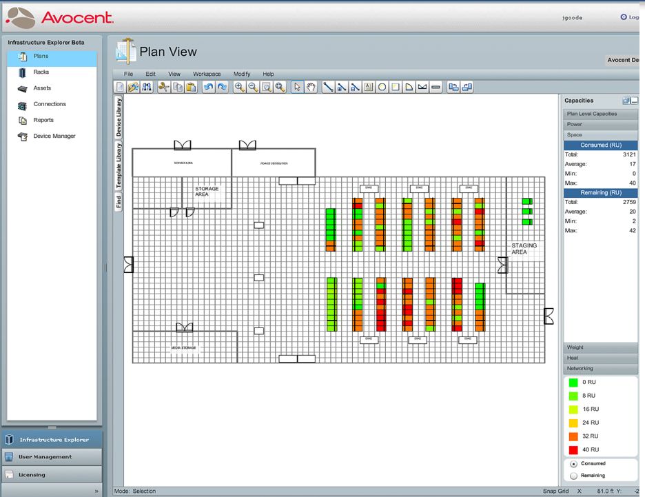 - Kapacitetsvisualisering – få en översikt över tillgänglig kapacitet och potentiella problem när det gäller utrymme, effekt, vikt, värme/kyla och nätverk. Ger korrekt information för att planera och reducera tiden som behövs för att genomföra kompletteringar och ändringar i datacentret. Förbättrar förändringsarbetets kvalitet och sänker kostnaderna för planering och dokumentation.