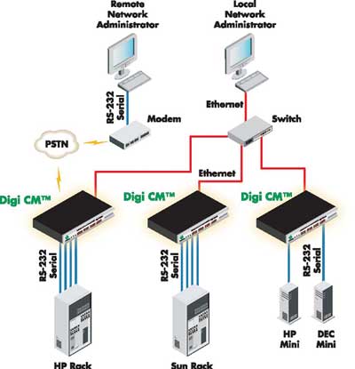 Digi CM är en terminalserver utrustad med funktioner och gränssnitt som är framtagna för en datorhallsmiljö. Den ger er möjligheten att kunna köra era seriella enheter med hjälp av ett mycket omtyckt textbaserat gränssnitt. Moderna grafiska miljöer finns givetvis också som tillval.