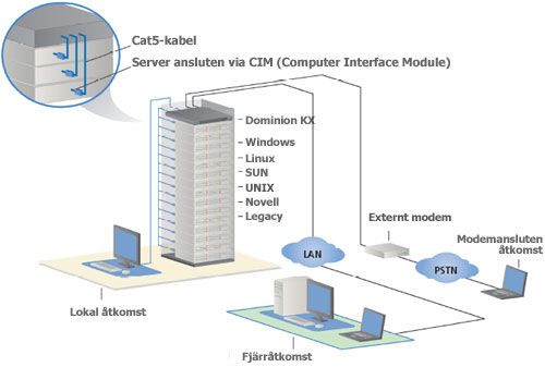Normal åtkomst till Dominion KX sker via IP eller via den lokala användarporten. Dominion KX är dessutom utrustad med port för ett externt modem. I nödfall kan man med andra ord nå KVM och alla anslutna servers även denna väg om IP inte är igång. Har man anslutit tex en IP drivande router eller switch kan man via modem slå av och på ström och ta kontakt med konsolen på utrustningen.