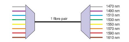 Att använda CWDM-muxar är ett enkelt sätt att utöka kapaciteten i befintlig fiber. Tekniken bygger på en helt passiv mux/demux, som blandar ljus av olika våglängder i ena änden (Mux) och som separerar ljuset (Demux) i andra änden. Metoden är standardiserad i ITU G.695 och 694.2 och används inom Ethernet, Fiber Channel, SAN och SONET. Upp till 16 duplexkanaler kan blandas i ett enda fiberpar.