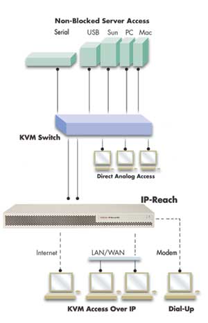Nu är det enkelt att alltid ha full kontroll över alla servers och annan utrustning i datahallen. Med Raritans IP-Reach kopplad till er serverväxel kan ni nå all ansluten utrustning via Internet, LAN/WAN eller ett modem. Även om ert nät är ur funktion kan ni nå utrustningen via det inbyggda ”nödmodemet” i IP Reach och tex. göra omstarter.