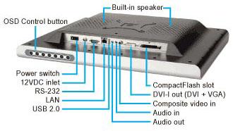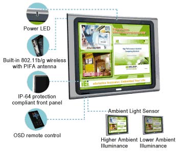 I sortimentet finns även 15-19 tums LCD skärmar med inbyggd spelare för både CAT5 nätverk och WIFI trådlöst nätverk och som har en front som är vatten- och dammskyddad i IP-klass 64. Skärmarnas utförande är mycket tilltalande och ger ett proffsigt och gediget intryck. På baksidan av skärmen finns det högtalare men det går även att koppla vidare ljudet till externa högtalare vid behov. Med den medföljande fjärrkontrollen kan ni kontrollera LCD skärmens olika inställningar.