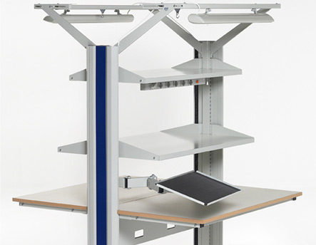 Genom olika hyllplan, el-lister och integrerade kabelrännor skapas lätt en arbetsplats för just era krav och er utrustning. En optimal lösning.